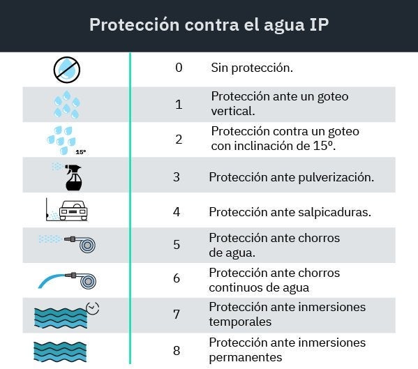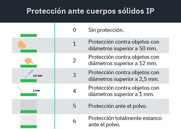 Un dato que suele acompañar a las luminarias es el Grado de Protección IP. Este se refiere al índice de protección que tiene ante el ingreso de sólidos y agua. Como podemos ver en la tabla de más abajo, a mayor índice, mayor será la protección que ofrece la luminaria frente a estos dos elementos. Al momento de leerlo, tengamos en cuenta que el primer número se refiere a la protección frente a sólidos (polvo) y el segundo a protección contra agua.